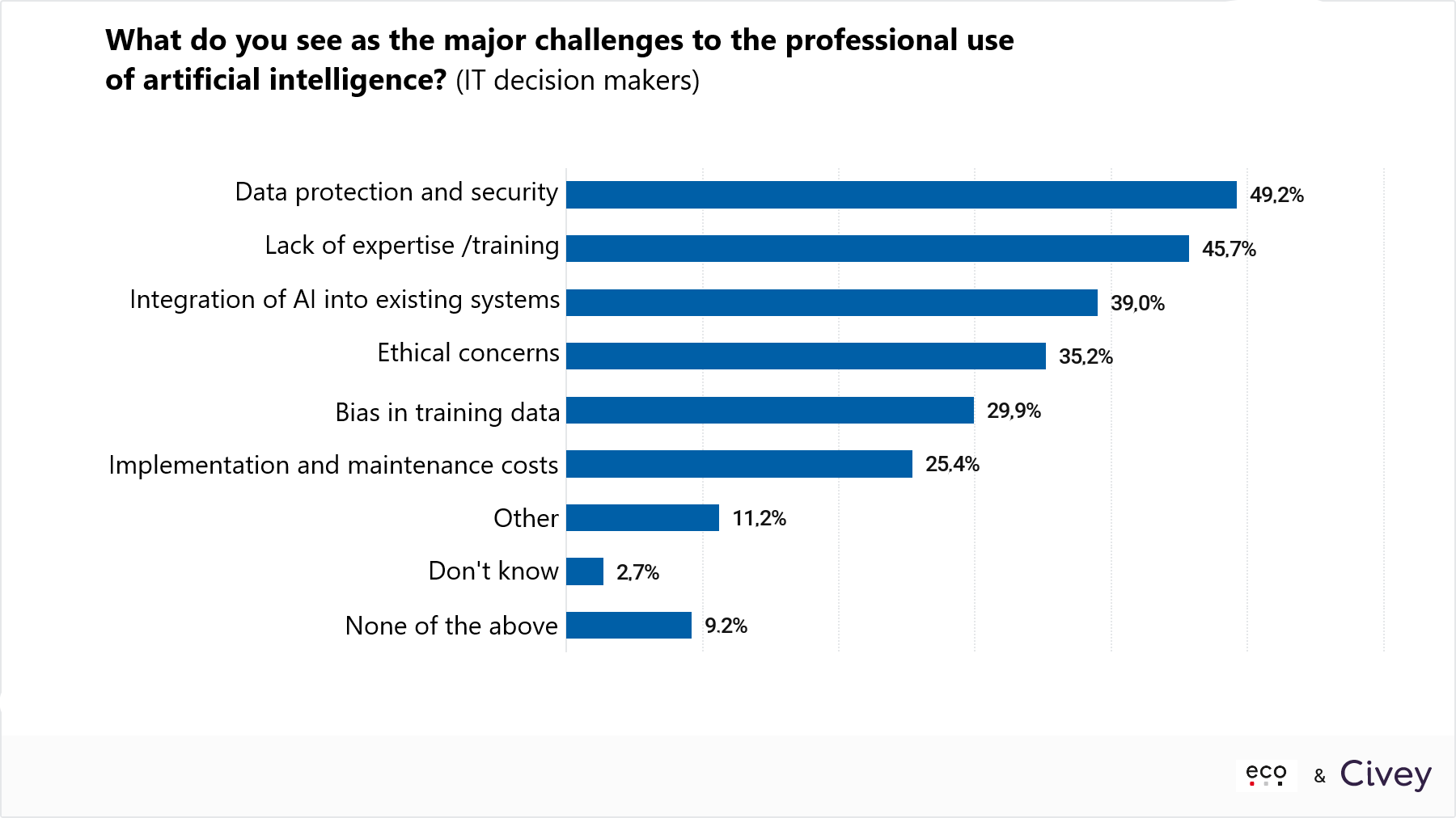 - Data protection and security are the major hurdles for every second company (49.2%) when using artificial intelligence