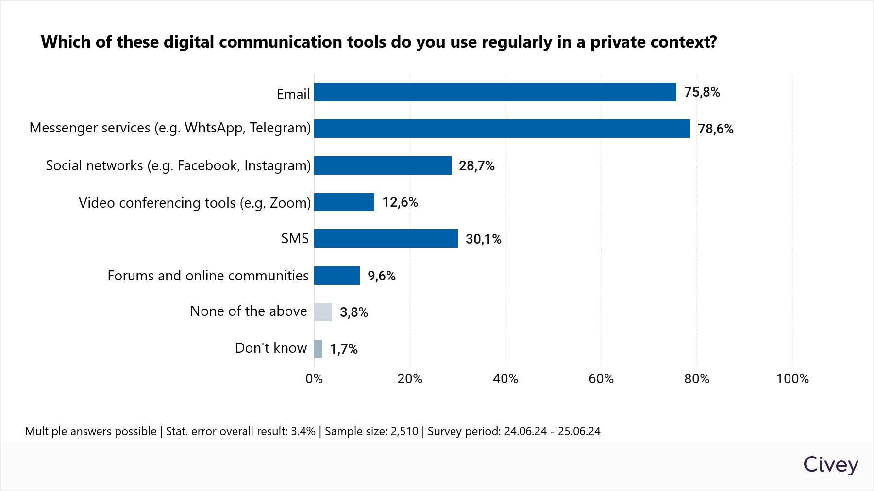 Even after 40 years of email in Germany, electronic mail remains the most popular means of communication. Email is by far the most frequently used means of communication, particularly in a professional context, but three quarters of the German population (75.8%) also regularly send emails in their private lives. This is shown by a recent representative survey by the eco – Association of the Internet Industry, which was conducted among around 2,500 citizens by the market and opinion research institute Civey. There is no sign of email being displaced; it will remain the most important Internet service in 2024.