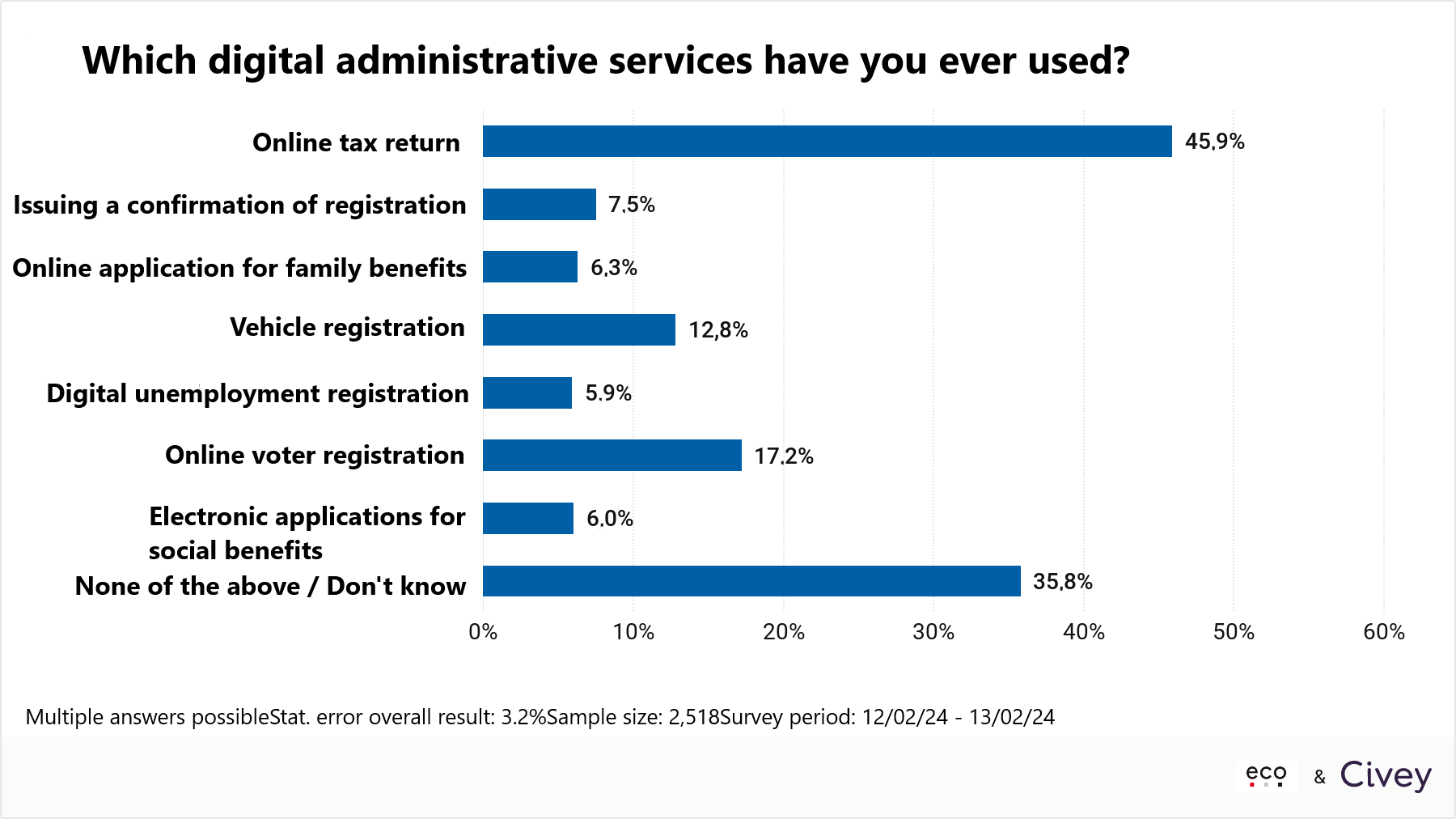 Citizens in Germany currently only use very few online administrative services. This is revealed in a recent representative survey conducted by the market and opinion research institute Civey on behalf of eco – Association of the Internet Industry. The most popular service is online tax returns, which are now used by almost one in two German people (45.9 per cent). 17.2 per cent of Germans have already used the option of registering online for postal voting in the past. 12.8 per cent have already registered a vehicle online, 5.9 per cent have registered as unemployed online and 6.3 per cent have applied for family benefits online.