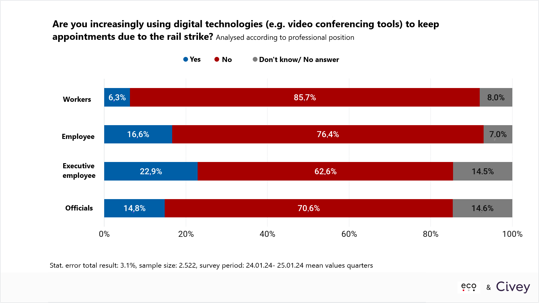 Millions of Germans are currently unable to get to to their usual workplaces or attend scheduled appointments due to the railway strike. A recent eco survey has shown that the use of digital technologies and applications such as video conferencing is once again the method of choice to compensate for this situation.