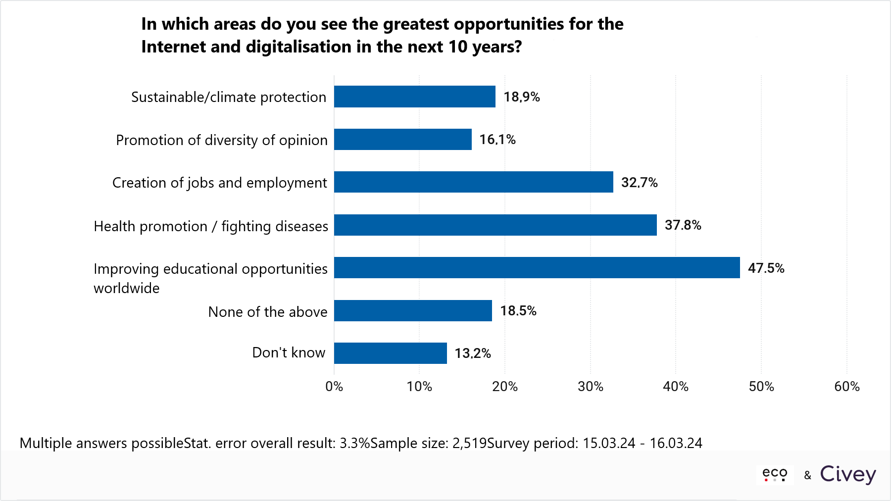 Digital services and technologies already offer great potential for addressing pressing global challenges. People in Germany see particularly strong potential in the education and health sectors, according to a representative survey of the population conducted by the market and opinion research institute Civey on behalf of eco – Association of the Internet Industry. 47.5% of respondents believe that the Internet will improve educational opportunities worldwide in the next 10 years. 37.8% expect positive effects on health promotion, while around 33% of Germans also expect advancing digitalisation to create additional jobs.