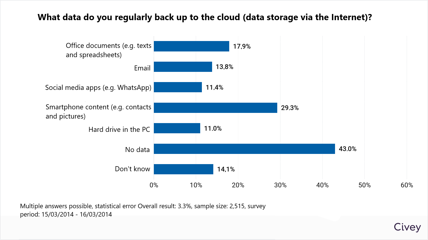 The majority of Germans still don’t back up their data to the cloud, risking the loss of valuable photos, videos and data. This is the result of a recent representative survey conducted by the market and opinion research institute Civey on behalf of eco – Association of the Internet Industry. Only one in three (29.3%) back up smartphone content such as contacts or pictures via the Internet. Only 11.4% back up social media apps, such as WhatsApp chats, online. 17.9% back up office documents such as texts and spreadsheets online. Only 13.8 per cent of Germans backups their emails online. Around one in two (43%) do not back up to the cloud at all.