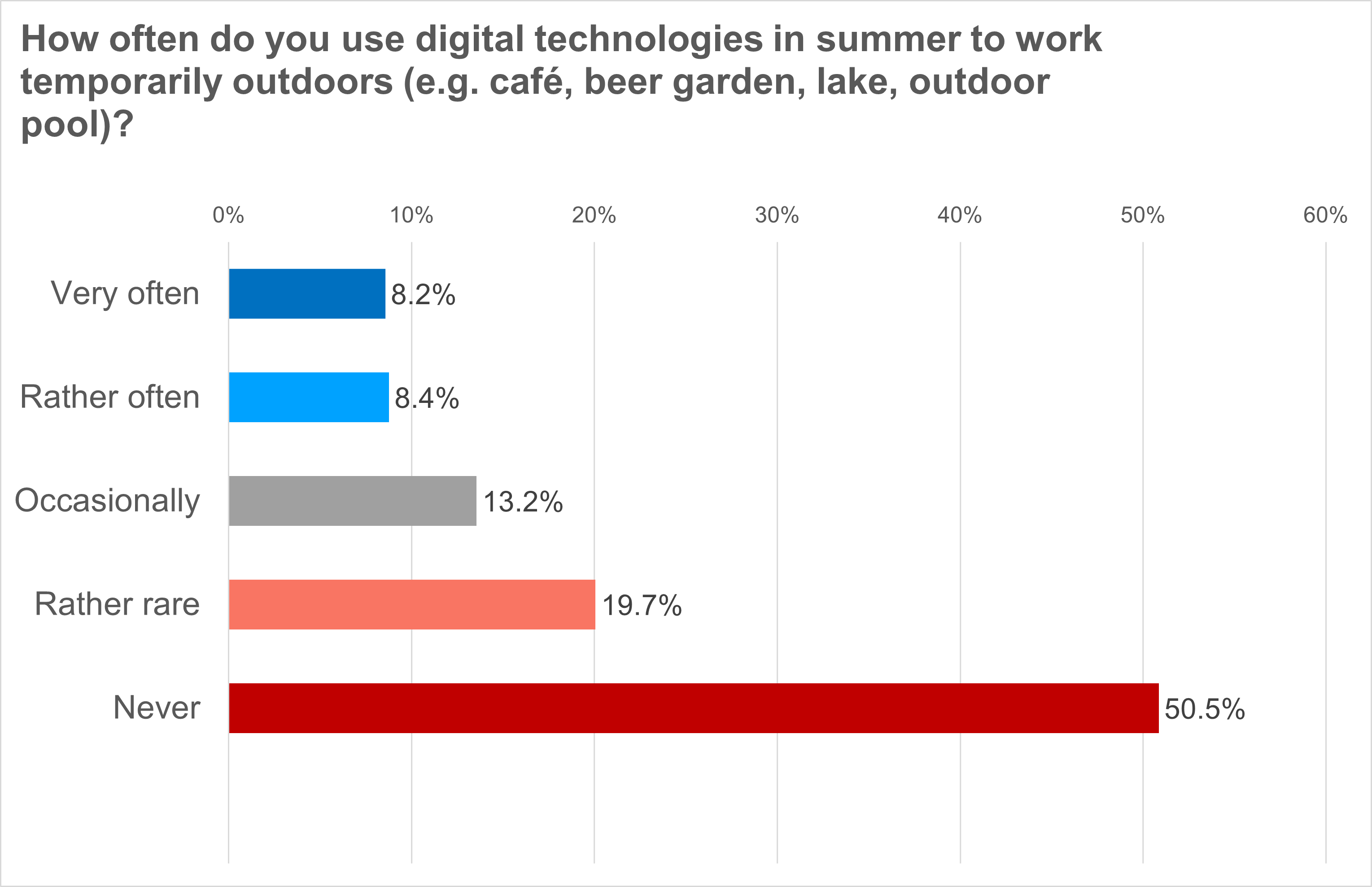 - 29.8 percent of Germans who are able to work remotely use digital technologies to work in places such as cafés, beer gardens, open-air swimming pools or at the lake in summer